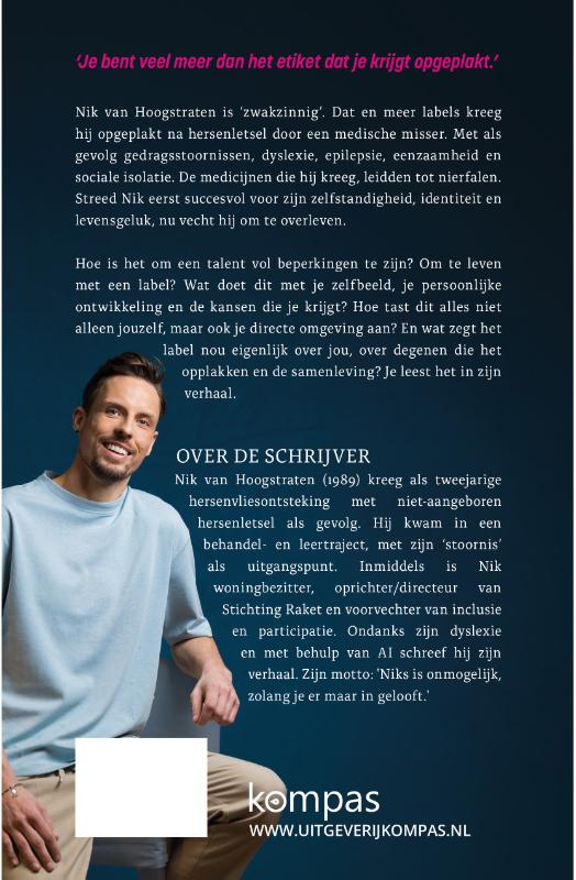 Nik van Hoogstraten is ‘zwakzinnig’. Dat en meer labels kreeg hij opgeplakt na hersenletsel door een medische misser. Met als gevolg gedragsstoornissen, dyslexie, epilepsie, eenzaamheid en sociale isolatie. De medicijnen die hij kreeg, leidden tot nierfalen. Streed Nik eerst succesvol voor zijn zelfstandigheid, identiteit en levensgeluk, nu vecht hij om te overleven. Hoe is het om een talent vol beperkingen te zijn? Om te leven met een label? Wat doet dit met je zelfbeeld, je persoonlijke ontwikkeling en de kansen die je krijgt? Hoe tast dit alles niet alleen jouzelf, maar ook je directe omgeving aan? En wat zegt het label nou eigenlijk over jou, over degenen die het opplakken en de samenleving?