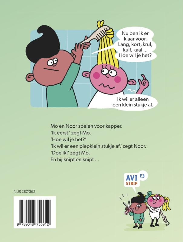 Mo en Noor spelen voor kapper. ‘Ik eerst,’ zegt Mo. ‘Hoe wil je het?’ ‘Ik wil er een piepklein stukje af,’ zegt Noor. ‘Doe ik!’ zegt Mo. En hij knipt en knipt … Elkaars haren knippen, dat is leuk. Noor heeft mooie lange haren. Mo begint met knippen. Eerst een klein plukje, maar dan knipt hij verder. Hij houdt maar niet op! Uiteindelijk gaat het helemaal mis. Arme Noor … Beeld en tekst versterken elkaar in deze verrassende strip voor beginnende lezers van Fleur van der Weel. Kinderen van 6 tot 8 jaar begrijpen de tekst op AVI-niveau E3 beter dankzij de kleurrijke illustraties die de tekst op elke bladzijde ondersteunen. Lees- én kijkplezier gegarandeerd. Leesniveau: AVI E3