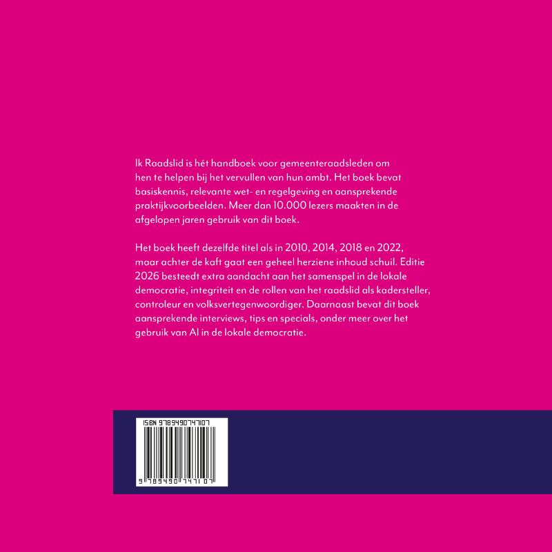Ik Raadslid is hét handboek voor gemeenteraadsleden om hen te helpen bij het vervullen van hun ambt. Het boek bevat basiskennis, relevante wet- en regelgeving en aansprekende praktijkvoorbeelden. Meer dan 10.000 lezers maakten in de afgelopen jaren gebruik van dit boek. Het boek heeft dezelfde titel als in 2010, 2014, 2018 en 2022, maar achter de kaft gaat een geheel herziene inhoud schuil. Editie 2026 besteedt extra aandacht aan het samenspel in de lokale democratie, integriteit en de rollen van het raadslid als kadersteller, controleur en volksvertegenwoordiger. Daarnaast bevat dit boek aansprekende interviews, tips en specials, onder meer over het gebruik van AI in de lokale democratie.