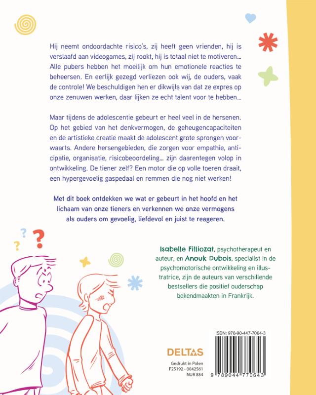 Wat gebeurt er in het hoofd en het lichaam van onze tieners? Met dit boek verkennen we onze vermogens als ouders om gevoelig, liefdevol en juist te reageren in deze uitdagende periode voor ouder en kind. Hij neemt ondoordachte risico’s, zij heeft geen vrienden, hij is verslaafd aan videogames, zij rookt, hij is totaal niet te motiveren… Alle pubers hebben het moeilijk om hun emotionele reacties te beheersen. En eerlijk gezegd verliezen ook wij, de ouders, vaak de controle! We beschuldigen hen er dikwijls van dat ze expres op onze zenuwen werken, daar lijken ze echt talent voor te hebben… Maar tijdens de adolescentie gebeurt er heel veel in de hersenen. Op het gebied van het denkvermogen, de geheugencapaciteiten en de artistieke creatie maakt de adolescent grote sprongen voorwaarts. Andere hersengebieden, die zorgen voor empathie, anticipatie, organisatie, risicobeoordeling… zijn daarentegen volop in ontwikkeling. De tiener zelf? Een motor die op volle toeren draait, een hypergevoelig gaspedaal en remmen die nog niet werken! Isabelle Filliozat, psychotherapeut en auteur, en Anouk Dubois, specialist in de psychomotorische ontwikkeling en illustratrice, zijn de auteurs van verschillende bestsellers die positief ouderschap bekendmaakten in Frankrijk.