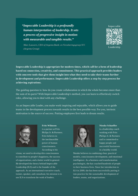 “ Impeccable Leadership is de diepmenselijke vertaling van leidinggeven. Het komt dichtbij en is herkenbaar, met meet- en voelbare resultaten die een proces van voortschrijdend inzicht in gang zetten.” Marc Lauwers, CEO Argenta Bank- en Verzekeringsgroep N.V. Impeccable Leadership past bij de huidige tijd, die vraagt om een vorm van leiderschap vanuit verbinding, creativiteit en commitment. Met deze praktische methode krijg je als leider concrete instrumenten aangereikt, die inzicht geven in wat je nodig hebt om je team verder te brengen in ontwikkeling en prestaties. De waarde van Impeccable Leadership is dat je stap voor stap een proces kunt opzetten om ambities waar te maken. Richtinggevende vraag is: hoe creëer je een samenwerking waarbij het geheel meer wordt dan de som der delen? Met de methode van Impeccable Leadership leer je als leidinggevende moeiteloos schakelen tussen rollen, waardoor je om kunt gaan met elke uitdaging die zich voordoet. Als Impeccable Leader maak je het werk inspirerend en plezierig. Zo kun je teams optimaal begeleiden in het proces van ontwikkeling naar resultaat, omdat je uitgaat van intrinsieke motivatie als bron van succes. Leiders die hun medewerkers centraal stellen, kunnen gedroomde resultaten neerzetten.