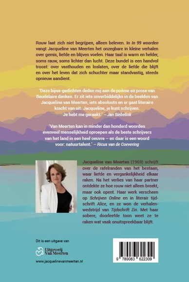 Rouw laat zich niet begrijpen, alleen beleven. In In 99 woorden vangt Jacqueline van Meerten het onzegbare in kleine verhalen over gemis, liefde en blijven voelen. Haar taal is warm en helder, soms rauw, soms lichter dan lucht. Deze bundel is een handvol troost: over vasthouden en loslaten, over de liefde die blijft en over het leven dat zich schuchter maar standvastig, steeds opnieuw aandient. ‘Deze bijna-gedichten deden mij aan de poème en prose van Baudelaire denken. Er zit iets onverbiddelijks in de beelden van Jacqueline van Meerten, iets absoluuts en er gaat literaire kracht van uit. Jacqueline, je kunt schrijven. Je hebt me geraakt.’ – Jan Siebelink ‘Van Meerten kan in minder dan honderd woorden evenveel menselijkheid oproepen als de beste schrijvers van het land in een heel oeuvre – en daar is een woord voor: natuurtalent.’ – Ricus van de Coevering Over de auteur Jacqueline van Meerten (1969) schrijft over de rafelranden van het bestaan, waar liefde en vergankelijkheid elkaar raken. Na het verlies van haar partner ontdekte ze hoe rouw niet alleen breekt, maar ook opent. Haar werk verscheen op Schrijven Online en in literair tijdschrift Alice, en ze won de verhalenwedstrijd van Tijdschrift Zin. Met haar sobere, doorleefde toon weet ze te raken wat vaak onuitspreekbaar blijft.