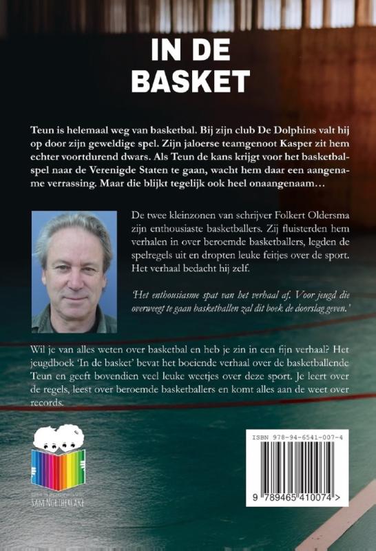 Teun is helemaal weg van basketbal. Bij zijn club De Dolphins valt hij op door zijn geweldige spel. Zijn jaloerse teamgenoot Kasper zit hem echter voortdurend dwars. Als Teun de kans krijgt voor het basketbalspel naar de Verenigde Staten te gaan, wacht hem daar een aangename verrassing. Maar die blijkt tegelijk ook heel onaangenaam… De twee kleinzonen van schrijver Folkert Oldersma zijn enthousiaste basketballers. Zij fluisterden hem verhalen in over beroemde basketballers, legden de spelregels uit en dropten leuke feitjes over de sport. Het verhaal bedacht hij zelf. ‘Het enthousiasme spat van het verhaal af. Voor jeugd die overweegt te gaan basketballen zal dit boek de doorslag geven.’ Wil je van alles weten over basketbal en heb je zin in een fijn verhaal? Het jeugdboek ‘In de basket’ bevat het boeiende verhaal over de basketballende Teun en geeft bovendien veel leuke weetjes over deze sport. Je leert over de regels, leest over beroemde basketballers en komt alles aan de weet over records.