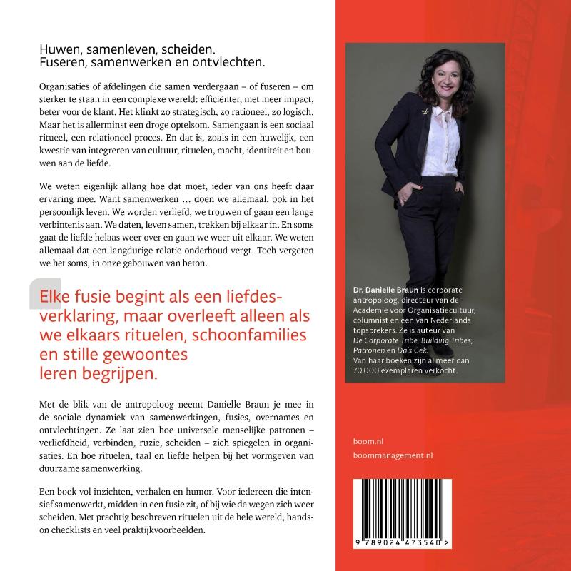 Huwen, samenleven, scheiden. Fuseren, samenwerken en ontvlechten. Organisaties of afdelingen die samen verdergaan – of fuseren – om sterker te staan in een complexe wereld: efficiënter, met meer impact, beter voor de klant. Het klinkt zo strategisch, zo rationeel, zo logisch. Maar het is allerminst een droge optelsom. Samengaan is een sociaal ritueel, een relationeel proces. En dat is, zoals in een huwelijk, een kwestie van integreren van cultuur, rituelen, macht, identiteit en bouwen aan de liefde. We weten eigenlijk allang hoe dat moet, ieder van ons heeft daar ervaring mee. Want samenwerken … doen we allemaal, ook in het persoonlijk leven. We worden verliefd, we trouwen of gaan een lange verbintenis aan. We daten, leven samen, trekken bij elkaar in. En soms gaat de liefde helaas weer over en gaan we weer uit elkaar. We weten allemaal dat een langdurige relatie onderhoud vergt. Toch vergeten we het soms, in onze gebouwen van beton. Elke fusie begint als een liefdesverklaring, maar overleeft alleen als we elkaars rituelen, schoonfamilies en stille gewoontes leren begrijpen. Met de blik van de antropoloog neemt Danielle Braun je mee in de sociale dynamiek van samenwerkingen, fusies, overnames en ontvlechtingen. Ze laat zien hoe universele menselijke patronen – verliefdheid, verbinden, ruzie, scheiden – zich spiegelen in organisaties. En hoe rituelen, taal en liefde helpen bij het vormgeven van duurzame samenwerking. Een boek vol inzichten, verhalen en humor. Voor iedereen die intensief samenwerkt, midden in een fusie zit, of bij wie de wegen zich weer scheiden. Met prachtig beschreven rituelen uit de hele wereld, hands-on checklists en veel praktijkvoorbeelden. Dr. Danielle Braun is corporate antropoloog, directeur van de Academie voor Organisatiecultuur, columnist en een van Nederlands topsprekers. Ze is auteur van De Corporate Tribe , Building Tribes , Patronen en Da’s Gek . Van haar boeken zijn al meer dan 70.000 exemplaren verkocht.