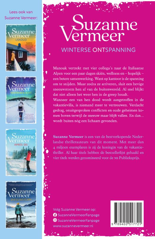 Manouk vertrekt met vier collega’s naar de Italiaanse Alpen voor een midweek skiën, wellness en – hopelijk – een betere samenwerking. Want op kantoor is de spanning om te snijden. Maar zodra ze arriveren, sluit een hevige sneeuwstorm hen af van de buitenwereld. Al snel blijkt dat niet alleen het weer hen in de greep houdt... Wanneer een van hen dood wordt aangetroffen in de vakantievilla, is niemand meer te vertrouwen. Verdacht gedrag, onuitgesproken conflicten en oude geheimen komen boven terwijl de sneeuw maar blijft vallen. En dan... wordt buiten nóg een lichaam gevonden.