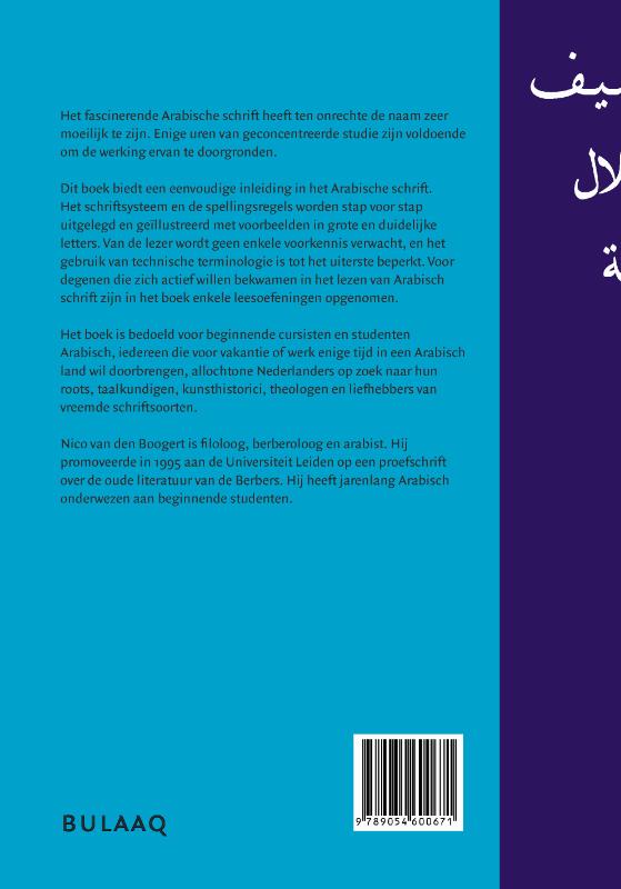 Het fascinerende Arabische schrift heeft ten onrechte de naam zeer moeilijk te zijn. Enige uren van geconcentreerde studie zijn voldoende om de werking ervan te doorgronden. Dit boek biedt een eenvoudige inleiding in het Arabische schrift. Het schriftsysteem en de spellingsregels worden stap voor stap uitgelegd en geïllustreerd met voorbeelden in grote en duidelijke letters. Van de lezer wordt geen enkele voorkennis verwacht, en het gebruik van technische terminologie is tot het uiterste beperkt. Voor degenen die zich actief willen bekwamen in het lezen van Arabisch schrift zijn in het boek enkele leesoefeningen opgenomen. Het boek is bedoeld voor beginnende cursisten en studenten Arabisch, iedereen die voor vakantie of werk enige tijd in een Arabisch land wil doorbrengen, allochtone Nederlanders op zoek naar hun roots, taalkundigen, kunsthistorici, theologen en liefhebbers van vreemde schriftsoorten. Nico van den Boogert is filoloog, berberoloog en arabist. Hij promoveerde in 1995 aan de Universiteit Leiden op een proefschrift over de oude literatuur van de Berbers. Hij heeft jarenlang Arabisch onderwezen aan beginnende studenten.