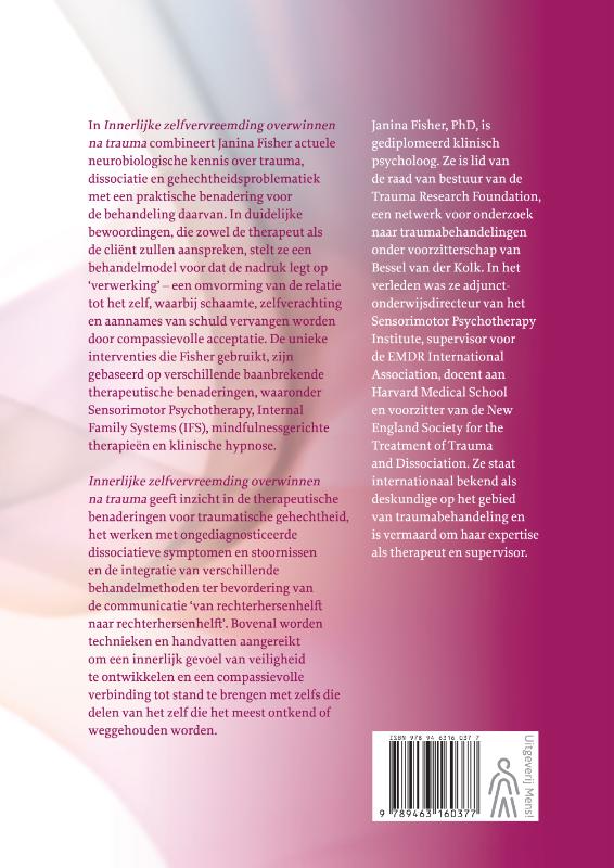 In 'Innerlijke zelfvervreemding overwinnen na trauma' combineert Janina Fisher actuele neurobiologische kennis over trauma, dissociatie en gehechtheidsproblematiek met een praktische benadering voor de behandeling daarvan. In duidelijke bewoordingen, die zowel de therapeut als de cliënt zullen aanspreken, stelt ze een behandelmodel voor dat de nadruk legt op ‘verwerking’ – een omvorming van de relatie tot het zelf, waarbij schaamte, zelfverachting en aannames van schuld vervangen worden door compassievolle acceptatie. De unieke interventies die Fisher gebruikt, zijn gebaseerd op verschillende baanbrekende therapeutische benaderingen, waaronder Sensorimotor Psychotherapy, Internal Family Systems (IFS), mindfulnessgerichte therapieën en klinische hypnose. 'Innerlijke zelfvervreemding overwinnen na trauma' geeft inzicht in de therapeutische benaderingen voor traumatische gehechtheid, het werken met ongediagnosticeerde dissociatieve symptomen en stoornissen en de integratie van verschillende behandelmethoden ter bevordering van de communicatie ‘van rechterhersenhelft naar rechterhersenhelft’. Bovenal worden technieken en handvatten aangereikt om een innerlijk gevoel van veiligheid te ontwikkelen en een compassievolle verbinding tot stand te brengen met zelfs die delen van het zelf die het meest ontkend of weggehouden worden. Janina Fisher, PhD, is klinisch psycholoog en geldt internationaal als toonaangevend deskundige in traumabehandeling. Ze is lid van de raad van bestuur van de Trauma Research Foundation, een netwerk voor onderzoek naar de behandeling van trauma onder voorzitterschap van Bessel van der Kolk. In het verleden was ze adjunct-onderwijsdirecteur van het Sensorimotor Psychotherapy Institute, supervisor voor de EMDR International Association, docent aan Harvard Medical School en voorzitter van de New England Society for the Treatment of Trauma and Dissociation.