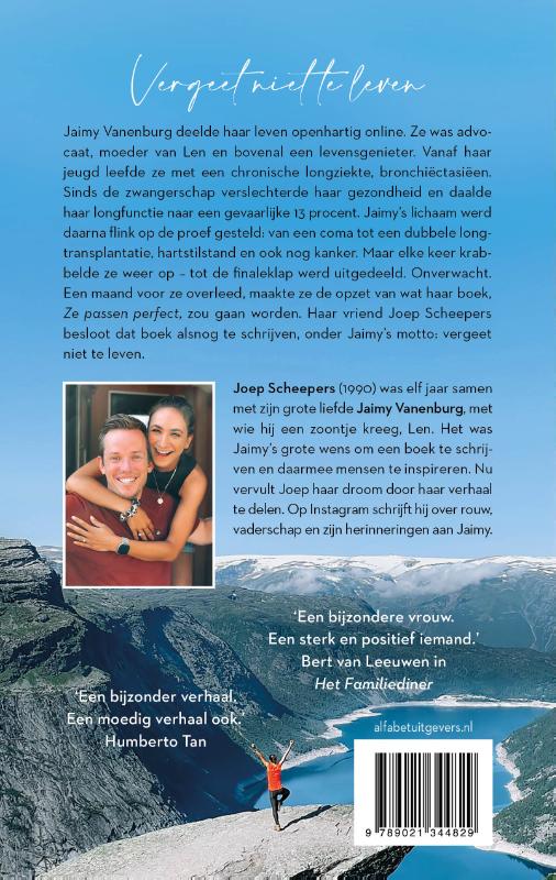Bestel nu de limited edition eerste druk met panterprint op snee. OP = OP Jaimy Vanenburg deelde haar leven openhartig online. Ze was advocaat, moeder van Len en bovenal een levensgenieter. Vanaf haar jeugd leefde ze met een chronische longziekte, bronchiëctasiëen. Sinds de zwangerschap verslechterde haar gezondheid en daalde haar longfunctie naar een gevaarlijke 13 procent. Jaimy’s lichaam werd daarna flink op de proef gesteld: van een coma tot een dubbele longtransplantatie, hartstilstand en ook nog kanker. Maar elke keer krabbelde ze weer op – tot de finaleklap werd uitgedeeld. Onverwacht. Een maand voor ze overleed, maakte ze de opzet van wat haar boek, Ze passen perfect, zou gaan worden. Haar vriend Joep Scheepers besloot dat boek alsnog te schrijven, onder Jaimy’s motto: vergeet niet te leven.
