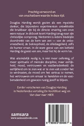Prachtig verwoord en van onschatbare waarde in deze tijd. Douglas Harding wordt gezien als een mystieke denker, die bijzondere experimenten ontwikkelde die bruikbaar zijn bij de directe ervaring van onze ware natuur. In dit boek keert Harding terug naar zijn christelijke oorsprong. Niettemin is iedere bladzijde doordrenkt van de kern van zen – van de onbevreesdheid, de beknoptheid, de alledaagsheid, zelfs de humor ervan. In de ware geest van zen behield Harding de geest van zen, maar liet hij de vorm los. Wat uiteindelijk nodig is, is niet meer oefening, of meer spirituele of mentale discipline, maar eerlijkheid, moed, vertrouwen en vastberadenheid: de eerlijkheid om te zien wat er te zien valt zonder het te verdraaien, de moed om het serieus te nemen, het vertrouwen om ernaar te handelen en de vastberadenheid om gewoon rustig jezelf te blijven. Eerder verschenen van Douglas Harding in Nederlandse vertaling 'De hoofdloze weg' (2021, oorspronkelijke titel: 'On Having No Head') en 'Van daar naar Hier' (2025, oorspronkelijke titel: 'Face To No-Face').