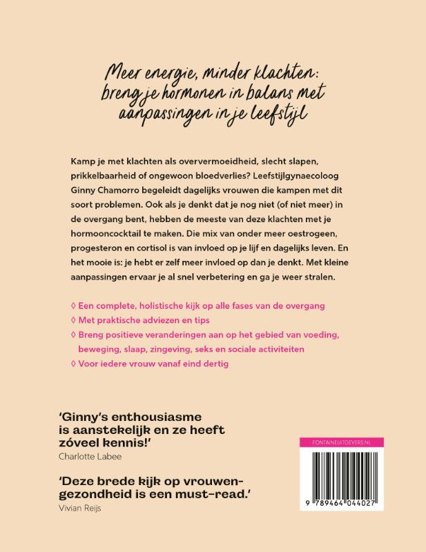 Meer energie, minder klachten: breng je hormonen zelf in balans met aanpassingen in je leefstijl Kamp je met klachten als oververmoeidheid, slecht slapen, prikkelbaarheid of ongewoon bloedverlies? Gynaecoloog Ginny Chamorro ziet in haar praktijk dagelijks vrouwen die te jong lijken voor de overgang, maar kampen met dit soort problemen. De meeste van die klachten hebben met je hormooncocktail te maken: de mix van onder meer oestrogeen, progesteron en cortisol. En daar kun je zelf iets aan doen. Dit boek bevat een complete, holistische kijk op alle fases van de overgang, met praktische tips en adviezen waarmee je je hormonen in balans brengt. • Ga aan de slag met voeding, ontspanning, zingeving, beweging, seks en sociale activiteiten • Aan de slag met kleine aanpassingen met een groots effect: voel je beter • Voor iedere vrouw vanaf eind dertig Leefstijlgynaecoloog Ginny Chamorro, alias Dr. Gynn, hielp al duizenden vrouwen hun energie terug te vinden en is bekend van haar interviews in onder meer de podcasts van Fajah Laurens ( Fajah onderzoekt ), Arie Boomsma, Libelle , Jan en AD . Hormoonsuppletie en operaties zijn soms een oplossing, maar vaak moest Ginny constateren dat er geen effectieve behandeling voorhanden was voor de vele onduidelijke klachten waarmee vrouwen bij haar kwamen. Door breder te kijken ontdekte ze dat aanpassingen in leefstijl een positief effect hebben. Je kunt er wél iets aan doen is een inspirerend boek dat vrouwen op een positieve manier door de premenopauze en menopauze helpt.