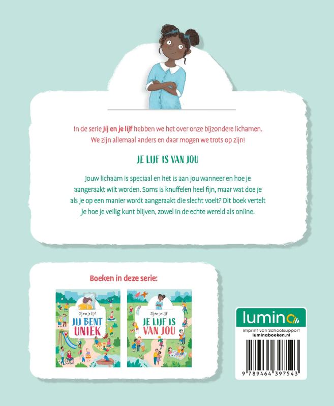 In de serie Jij en je lijf hebben we het over onze bijzondere lichamen. We zijn allemaal anders en daar mogen we trots op zijn! JE LIJF IS VAN JOU Jouw lichaam is speciaal en het is aan jou wanneer en hoe je aangeraakt wilt worden. Soms is knuffelen heel fijn, maar wat doe je als je op een manier wordt aangeraakt die slecht voelt? Dit boek vertelt je hoe je veilig kunt blijven, zowel in de echte wereld als online.