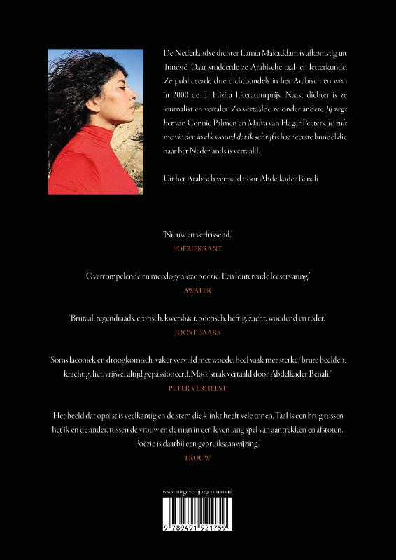 De poëzie van Lamia Makaddam is de uitkomst van strijd. Rauwe beelden worden opgevolgd door erupties van tederheid, een bezweringsdans waarin geliefde, minnaars en partners worden vastgehouden, losgelaten en ten grave gedragen. Niemand is onschuldig in de liefde. Lamia Makaddam kan niet om haar sentiment heen, maar kan ook niet om haar verlangen naar wraak, dus wordt de wraak een sentimentele aangelegenheid, warmbloedig. Lamia Makaddam kwam op twintigjarige leeftijd naar Nederland. In haar geboorteland Tunesië studeerde ze Arabische taal en letterkunde. Naast dichter is ze vertaler en journalist. Ze publiceerde drie dichtbundels in het Arabisch: ‘Het smaakt naar wintervruchten’ (2007), ‘Dit gedicht is af’ (2015) en ‘In de tijd en buiten de tijd’ (2018) dat nu in het Nederlands verschijnt onder de titel: ‘Je zult me vinden in elk woord dat ik schrijf’. In 2016 verscheen in Caïro haar vertaling van ‘Jij zegt het’ van Connie Palmen en in 2018 in Beiroet haar vertaling van ‘Malva’ van Hagar Peeters. In 2000 won Lamia Makaddam de El Hizjra literatuurprijs. Uit het Arabisch vertaald door Abdelkader Benali en de auteur