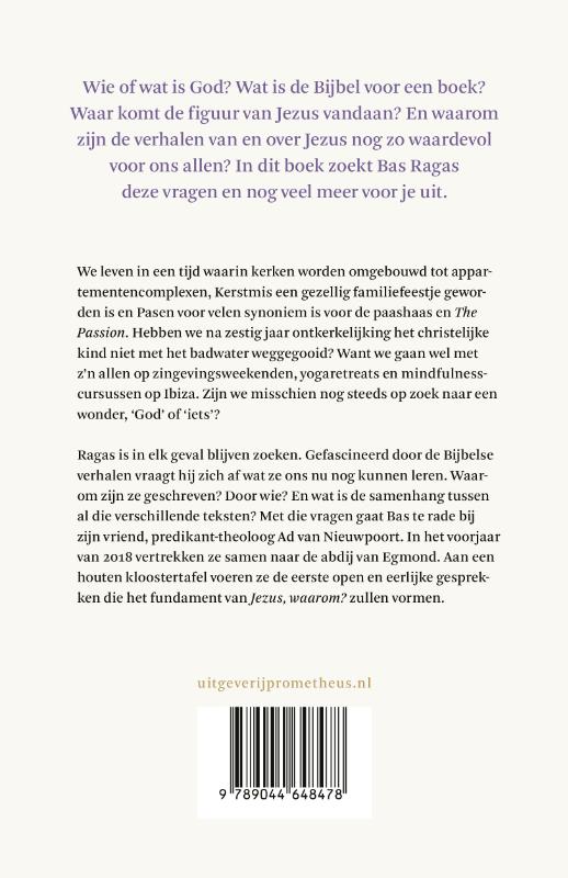 Wie of wat is God? Wat is de Bijbel voor een boek? Waar komt de figuur van Jezus vandaan? En waarom zijn de verhalen van en over Jezus nog zo waardevol voor ons allen? In dit boek zoekt Bas Ragas deze vragen en nog veel meer voor je uit. We leven in een tijd waarin kerken worden omgebouwd tot appartementencomplexen, Kerstmis een gezellig familiefeestje geworden is en Pasen voor velen synoniem is voor de paashaas en The Passion. Hebben we na dertig jaar ontkerkelijking het christelijke kind niet met het badwater weggegooid? Want we gaan wel met z’n allen op zingevingsweekenden, yogaretreats en mindfulnesscursussen op Ibiza. Zijn we misschien nog steeds op zoek naar een wonder, ‘God’ of ‘iets’? Ragas is in elk geval blijven zoeken. Gefascineerd door de Bijbelse verhalen vraagt hij zich af wat ze ons nu nog kunnen leren. Waarom zijn ze geschreven? Door wie? En wat is de samenhang tussen al die verschillende teksten? Met die vragen gaat Bas te rade bij zijn vriend, predikant-theoloog Ad van Nieuwpoort. In het voorjaar van 2018 vertrekken ze samen naar de abdij van Egmond. Aan een houten kloostertafel voeren ze de eerste open en eerlijke gesprekken die het fundament van Jezus, waarom? zullen vormen. Bas Ragas (1971) is zanger, theaterproducent en bestsellerschrijver van onder meer Maar je krijgt er heel veel voor terug en Papa is heel even aan de telefoon. Ad van Nieuwpoort (1966) is theoloog, predikant van de Haagse Duinzichtkerk en schrijver van onder meer Uit de tijd. Wat bezielt een liberale dorpsdominee en Leven! zonder oplossing. De parabel van Job als levensles.