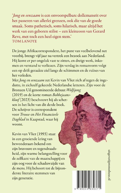 De schrijver zelf, in HP/De Tijd : ‘Als ik geen grote tuin had gehad, had ik me allang verhangen.’ Vijf jaar nadat hij naar Zuid-Afrika vertrok is Kevin van Vliet terug in Nederland om een nieuw werkvisum aan te vragen. Daar wordt hij geconfronteerd met zijn vroegere zelf en dreigt hij emplooi en verstand te verliezen. Het verslag van dat bezoek, in romanvorm, volgt een jonge journalist op reis langs de ruïnes van zijn verleden. Van Vliet (1993) werkte zeven jaar in de coulissen van de journalistiek – eerst HP/De Tijd , toen Hilversum, vervolgens naar de kranten – en is momenteel correspondent in Zuid-Afrika voor Trouw en Het Financieele Dagblad . Zijn voor een Bronzen Uil genomineerde literaire debuut, de novelle Wolfsjong (2019), alsook de korte roman Bobbejaanskloof (2023) zijn schetsen in vergelijking met het proza dat nu onder de evenaar naar buiten is gebroken. Met Jong en eenzaam opent Van Vliet de aanval op de huidige stand van de Nederlandse literatuur. Dit is de roman waar ons ingeslapen, in zichzelf gekeerde taalgebied op wacht. Kevin van Vliet (1993) is correspondent in Zuid-Afrika voor Trouw en Het Financieele Dagblad . Voor zijn literaire debuut, de novelle Wolfsjong , ontving hij in 2020 een nominatie voor de Bronzen Uil. Hij woont en werkt in Kaapstad. Over Wolfsjong : ‘Een bijna sprookjesachtige vertelling.’ Pieter van der Wielen, Nooit Meer Slapen ‘Een spannend en sfeervol verhaal.’ Tzum Over Bobbejaanskloof : ‘Rauw en ongrijpbaar.’ NRC ‘Een broeierig boek.’ Trouw Over de auteur en zijn werk in het algemeen: ‘Reviaans.’ Thomas de Veen ‘Een geniale nieuwe schrijver.’ Margreet Dolman