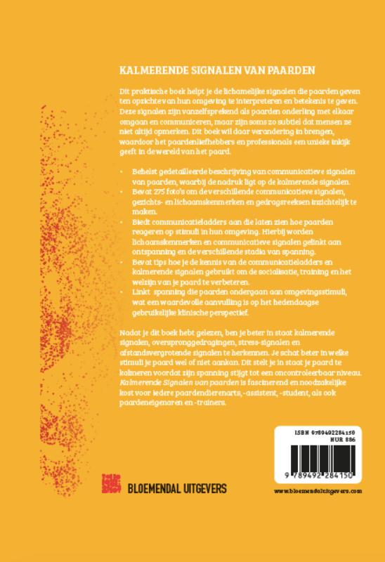 Dit praktische boek helpt je de lichamelijke signalen die paarden geven ten opzichte van hun omgeving te interpreteren en betekenis te geven. Deze signalen zijn vanzelfsprekend als paarden onderling met elkaar omgaan en communiceren, maar zijn soms zo subtiel dat mensen ze niet altijd opmerken. Dit boek wil daar verandering in brengen, waardoor het paardenliefhebbers en professionals een unieke inkijk geeft in de wereld van het paard. • Behelst gedetailleerde beschrijving van communicatieve signalen van paarden, waarbij de nadruk ligt op de kalmerende signalen. • Bevat 275 foto’s om de verschillende communicatieve signalen, gezichts- en lichaamskenmerken en gedragsreeksen inzichtelijk te maken. • Biedt communicatieladders aan die laten zien hoe paarden reageren op stimuli in hun omgeving. Hierbij worden lichaamskenmerken en communicatieve signalen gelinkt aan ontspanning en de verschillende stadia van spanning. • Bevat tips hoe je de kennis van de communicatieladders en kalmerende signalen gebruikt om de socialisatie, training en het welzijn van je paard te verbeteren. • Linkt spanning die paarden ondergaan aan omgevingsstimuli, wat een waardevolle aanvulling is op het hedendaagse gebruikelijke klinische perspectief Nadat je dit boek hebt gelezen, ben je beter in staat kalmerende signalen, overspronggedragingen, stress-signalen en afstandsvergrotende signalen te herkennen. Je schat beter in welke stimuli je paard wel of niet aankan. Dit stelt je in staat je paard te kalmeren voordat zijn spanning stijgt tot een oncontroleerbaar niveau. Kalmerende Signalen van paarden is fascinerend en noodzakelijke kost voor iedere paarden-dierenarts, -assistent, -student, als ook paardencoaches, paardeneigenaren en -trainers.
