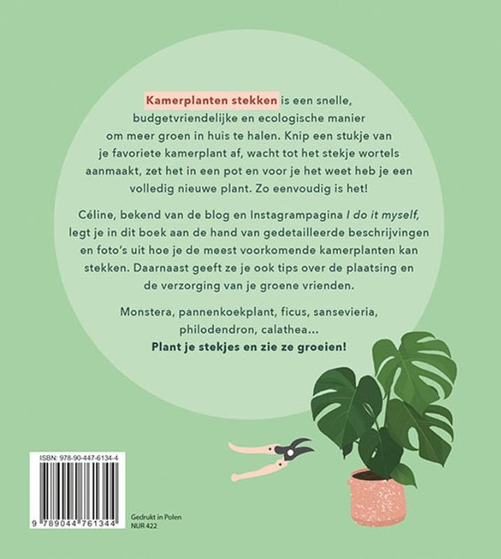 Kamerplanten stekken is een snelle, budgetvriendelijke en ecologische manier om meer groen in huis te halen. Knip een stukje van je favoriete kamerplant af, wacht tot het stekje wortels aanmaakt, zet het in een pot en voor je het weet heb je een volledig nieuwe plant. Zo eenvoudig is het! Céline, bekend van de blog en Instagrampagina I do it myself, legt je in dit boek aan de hand van gedetailleerde beschrijvingen en foto’s uit hoe je de meest voorkomende kamerplanten kan stekken. Daarnaast geeft ze je ook tips over de plaatsing en de verzorging van je groene vrienden. Monstera, pannenkoekplant, ficus, sansevieria, philodendron, calathea… Plant je stekjes en zie ze groeien!