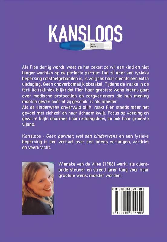 Als Fien dertig wordt, weet ze het zeker: ze wil een kind en niet langer wachten op de perfecte partner. Dat zij door een fysieke beperking rolstoelgebonden is, is volgens haar slechts een extra uitdaging. Geen onoverkomelijk obstakel. Tijdens de intake in de fertiliteitskliniek blijkt dat Fien haar grootste wens ineens gaat over medische protocollen en zorgverleners die hun mening moeten geven over of zij geschikt is als moeder. Als de kinderwens onvervuld blijft, raakt Fien steeds meer het gevoel met zichzelf en haar lichaam kwijt. Focus op voeding en gewicht blijkt daarmee haar reddingsboei, en ook haar grootste vijand. Kansloos – Geen partner, wel een kinderwens en een fysieke beperking is een verhaal over een intens verlangen, verdriet en veerkracht
