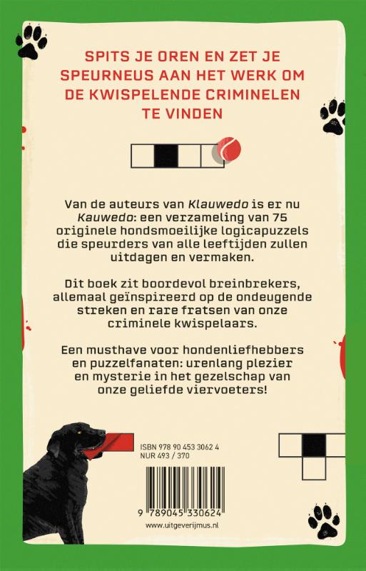 SPITS JE OREN EN ZET JE SPEURNEUS AAN HET WERK OM DE KWISPELENDE CRIMINELEN TE VINDEN Van de auteurs van Klauwedo is er nu Kauwedo: een verzameling van 75 originele hondsmoeilijke logicapuzzels die speurders van alle leeftijden zullen uitdagen en vermaken. Dit boek zit boordevol breinbrekers, allemaal geïnspireerd op de ondeugende streken en rare fratsen van onze criminele kwispelaars. Een musthave voor hondenliefhebbers en puzzelfanaten: urenlang plezier en mysterie in het gezelschap van onze geliefde viervoeters!