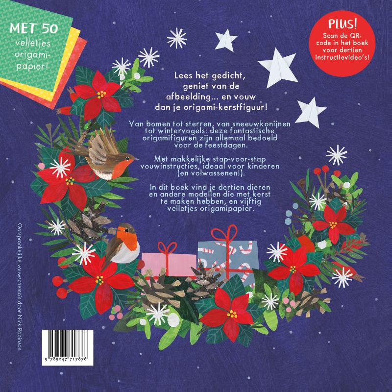 Met het nieuwe boek in onze origami-serie maak je de mooiste versieringen voor Kerstmis (en de rest van het jaar). Van pinguïns tot sneeuwkonijnen en van sterren tot cadeaudoosjes – al deze prachtige origamifiguren zijn geïnspireerd op de winter en de kerstmaand. De makkelijke stap-voor-stap vouwinstructies zijn ideaal voor kinderen (en volwassenen) en worden voorafgegaan door een bijpassend gedichtje. Met dertien vrolijke versierselen om te vouwen, vijftig velletjes origamipapier en een QR-code naar de instructievideo’s.
