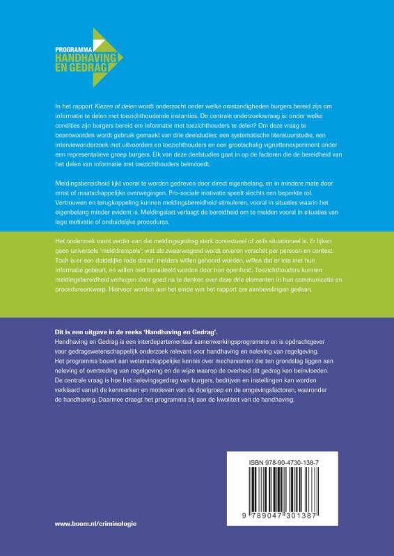 In het rapport Kiezen of delen wordt onderzocht onder welke omstandigheden burgers bereid zijn om informatie te delen met toezichthoudende instanties. De centrale onderzoeksvraag is: onder welke condities zijn burgers bereid om informatie met toezichthouders te delen? Om deze vraag te beantwoorden wordt gebruik gemaakt van drie deelstudies: een systematische literatuurstudie, een interviewonderzoek met uitvoerders en toezichthouders en een grootschalig vignettenexperiment onder een representatieve groep burgers. Elk van deze deelstudies gaat in op de factoren die de bereidheid van het delen van informatie met toezichthouders beïnvloedt. Meldingsbereidheid lijkt vooral te worden gedreven door direct eigenbelang, en in mindere mate door ernst of maatschappelijke overwegingen. Pro-sociale motivatie speelt slechts een beperkte rol. Vertrouwen en terugkoppeling kunnen meldingsbereidheid stimuleren, vooral in situaties waarin het eigenbelang minder evident is. Meldingslast verlaagt de bereidheid om te melden vooral in situaties van lage motivatie of onduidelijke procedures. Het onderzoek toont verder aan dat meldingsgedrag sterk contextueel of zelfs situationeel is. Er lijken geen universele ‘melddrempels’; wat als zwaarwegend wordt ervaren verschilt per persoon en context. Toch is er een duidelijke rode draad: melders willen gehoord worden, willen dat er iets met hun informatie gebeurt, en willen niet benadeeld worden door hun openheid. Toezichthouders kunnen meldingsbereidheid verhogen door goed na te denken over deze drie elementen in hun communicatie en procedureontwerp. Hiervoor worden aan het einde van het rapport zes aanbevelingen gedaan. Dit is een uitgave in de reeks ‘Handhaving en Gedrag’. Handhaving en Gedrag is een interdepartementaal samenwerkingsprogramma en is opdrachtgever voor gedragswetenschappelijk onderzoek relevant voor handhaving en naleving van regelgeving. Het programma bouwt aan wetenschappelijke kennis over mechanismen die ten grondslag liggen aan naleving of overtreding van regelgeving en de wijze waarop de overheid dit gedrag kan beïnvloeden. De centrale vraag is hoe het nalevingsgedrag van burgers, bedrijven en instellingen kan worden verklaard vanuit de kenmerken en motieven van de doelgroep en de omgevingsfactoren, waaronder de handhaving. Daarmee draagt het programma bij aan de kwaliteit van de handhaving.