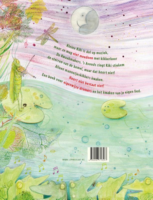 Iedereen weet dat alleen kikkermannetjes kunnen zingen. Alle kikkervrouwtjes vallen in katzwijm als het Kikkerkoor optreedt. Maar Kiki zingt ook graag. Dat hoort niet, vindt de kikkerdirigent, dus Kiki zingt alleen voor zichzelf, voor de maan en voor de krekel die viool speelt. Op een dag, juist als het Kikkerkoor weer gaat optreden, komt er een reiger langs… En reigers zijn verzot op kikkers. Zonder dat ze het doorheeft, weet Kiki een ramp te voorkomen. Een vrolijk kwakend en ook ontroerend prentenboek over gelijkwaardigheid, geloven in jezelf en het volgen van je dromen.