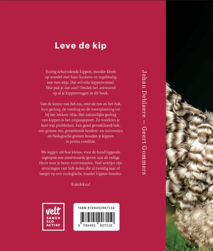 Rustig scharrelende kippen, moederkloek op wandel met haar kuikens en regelmatig een vers eitje. Dat wil elke kippenvriend. Hoe pak je dat aan? Ontdek het antwoord op al je kippenvragen in dit boek. Van de keuze van het ras, over de ren en het hok, hun gedrag, de voeding en de voortplanting tot bij het lekker eitje. Het natuurlijke gedrag van kippen is het uitgangspunt. Zo voorkom je heel wat problemen. Een goed geventileerd hok, een groene ren, gevarieerde keuken- en tuinrestjes en biologische granen houden je kippen in prima conditie. We leggen uit hoe kleine, voor de hand liggende ingrepen een meerwaarde geven aan de veilige thuis voor je beste tuinvrienden. Veel weetjes zijn ervaringen van Velt-leden die al twintig jaar of langer op een ecologische manier kippen houden.