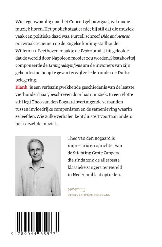 Wie tegenwoordig naar het Concertgebouw gaat, wil mooie muziek horen. Het publiek staat er niet bij stil dat die muziek vaak een politieke daad was. Purcell schreef Dido and Aeneas om wraak te nemen op de Engelse koning-stadhouder Willem III. Beethoven maakte de Eroica omdat hij geloofde dat de wereld door Napoleon mooier zou worden. Sjostakovitsj componeerde de Leningradsymfonie om de inwoners van zijn geboortestad hoop te geven terwijl ze leden onder de Duitse belegering. Klank! is een verbazingwekkende geschiedenis van de laatste vierhonderd jaar, beschreven door zijn muziek. In een vlotte stijl legt Theo van den Bogaard overtuigende verbanden tussen invloedrijke componisten en de samenleving waarin ze leefden. Wie zulke verhalen kent, luistert voortaan anders naar dezelfde muziek. Theo van den Bogaard is impresario en oprichter van de Stichting Grote Zangers, die sinds 2010 de allerbeste klassieke zangers ter wereld in Nederland laat optreden.