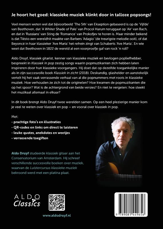 Je hoort het goed: klassieke muziek klinkt door in talloze popsongs! Veel mensen weten wel dat bijvoorbeeld ‘The 5th’ van Ekseption gebaseerd is op de ‘Vijfde’ van Beethoven, dat ‘A Whiter Shade of Pale’ van Procol Harum teruggaat op ‘Air’ van Bach, en dat in ‘Russians’ van Sting de ‘Romance’ van Prokofjev te horen is. Maar minder bekend is dat Tiësto een wereldhit maakte van Barbers ‘Adagio’ (de treurigste melodie ooit), of dat Beyoncé in haar klassieker ‘Ave Maria’ het refrein zingt van Schuberts ‘Ave Maria’. En wie weet dat Beethoven in 1822 de wereld al een voorproefje gaf van rock ’n roll? Aldo Druyf, klassiek gitarist, kenner van klassieke muziek en bevlogen popliefhebber, bespreekt in Klassiek in pop zestig songs waarin popmuzikanten zich hebben laten inspireren door hun klassieke voorgangers. Hij doet dat op dezelfde toegankelijke manier als in zijn succesvolle boek Klassiek in zicht (2018). Deskundig, glashelder en aanstekelijk vertelt hij het vaak verrassende verhaal van al die popnummers met roots in klassieke muziek. Hoe verhouden ze zich tot de originelen? Hoe kwamen de popmuzikanten die op het spoor? Wat is de achtergrond van beide versies? En niet te vergeten: hoe steekt het muzikaal allemaal in elkaar? In dit boek brengt Aldo Druyf twee werelden samen. Op een heel plezierige manier kom je veel te weten over klassiek en pop – en vooral over klassiek in pop. Met: - prachtige foto’s en illustraties - QR-codes en links om direct te luisteren - leuke quotes, anekdotes en weetjes - verrassende toegiften