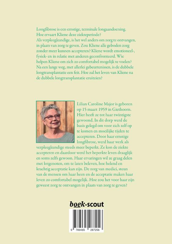 Longfibrose is een ernstige, terminale longaandoening. Hoe ervaart Kliene deze ziekteperiode? Als verpleegkundige, is het wel anders om zorg te ontvangen, in plaats van zorg te geven. Zou Kliene alle geboden zorg zonder meer kunnen accepteren? Kliene wordt emotioneel-, fysiek- en in relatie met anderen geconfronteerd. Wie helpen Kliene om zich zo comfortabel mogelijk te voelen? Na een lange weg, met allerlei gebeurtenissen, is de dubbele longtransplantatie een feit. Hoe zal het leven van Kliene na de dubbele longtransplantatie eruitzien?