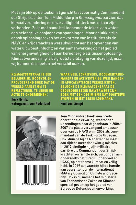 In 2016 hield toenmalig Commandant der Strijdkrachten Tom Middendorp een toespraak in het Vredespaleis, waarin hij waarschuwde voor de gevolgen van klimaatverandering. Na afloop werden zijn woorden al snel opgepakt door de media. 'Middendorp zegt dat klimaatverandering de wereldvrede bedreigt', schreef de NOS op haar website. De toon was gezet, 'de klimaatgeneraal' was geboren. Dankzij zijn jarenlange ervaring weet Middendorp precies hoe het leger te werk gaat. Het viel hem op dat er heel weinig aandacht was voor het klimaat, en hoe schadelijk dat is voor ons voortbestaan. Met zijn blik op de toekomst gericht laat Middendorp in Klimaatgeneraal zien dat klimaatverandering en onze veiligheid sterk met elkaar zijn verbonden. Vaak ontstaan conflicten, of zelfs oorlogen, door schaarste. Ook kan die schaarste leiden tot migratiestromen en een voedingsbodem zijn voor extremisme. Zo is met name het toenemende tekort aan water een belangrijke aanjager van spanningen. Maar gelukkig zijn er ook oplossingen: van het omvormen van instituties als de NAVO en krijgsmachten wereldwijd tot aan het opvangen van water uit woestijnlucht; en van samenwerking op het gebied van energieveiligheid tot aan kernenergie als tussenoplossing. Klimaatverandering is de grootste uitdaging van deze tijd, maar wij moeten het verschil maken.