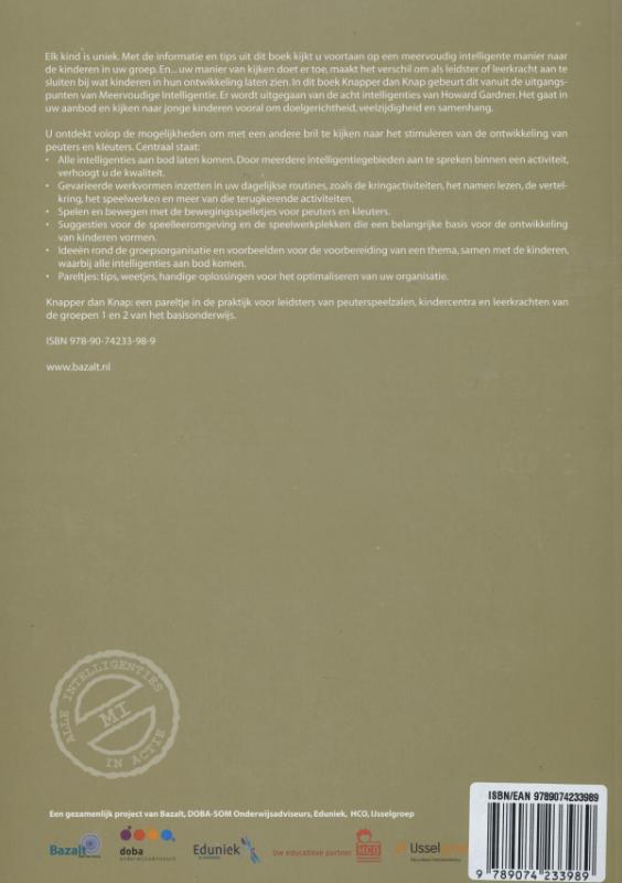 Het boek Knapper dan Knap laat u met een andere bril kijken naar de ontwikkeling van peuters en kleuters. Dit gebeurt vanuit de uitgangspunten van MI. Door meerdere intelligentiegebieden aan te spreken binnen een activiteit, verhoogt u de kwaliteit ervan. U maakt o.a. gebruik van de volgende werkvormen: kringactiviteiten, namen lezen, vertelkring, het speelwerken en meer van die terugkerende activiteiten. In Knapper dan Knap vindt u ook: bewegingsspelletjes voor peuters en kleuters suggesties voor de speelleeromgeving en de speelwerkplekken ideeën voor de groepsorganisatie en voorbeelden voor het voorbereiden van een thema. Knapper dan Knap biedt volop mogelijkheden om meteen te beginnen in de praktijk. Het maakt uw aanbod veelzijdiger en rijker.