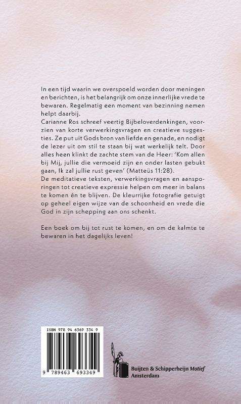 In een tijd waarin we overspoeld worden door meningen en berichten, is het belangrijk om onze innerlijke vrede te bewaren. Regelmatig een moment van bezinning nemen helpt daarbij. Carianne Ros schreef 40 bijbeloverdenkingen, voorzien van korte verwerkingsvragen en creatieve suggesties. Ze put uit Gods bron van liefde en genade, en nodigt de lezer uit om stil te staan bij wat werkelijk telt. Door alles heen klinkt de zachte stem van de Heer: ‘Kom allen bij Mij, jullie die vermoeid zijn en onder lasten gebukt gaan, Ik zal jullie rust geven.’ (Matteüs 11:28-30) De meditatieve teksten, verwerkingsvragen en aansporingen tot creatieve expressie helpen om meer in balans te komen én te blijven. De kleurrijke fotografie getuigt op geheel eigen wijze van de schoonheid en vrede die God in zijn schepping aan ons schenkt. Een boek om bij tot rust te komen, en om de kalmte te bewaren in het dagelijks leven!