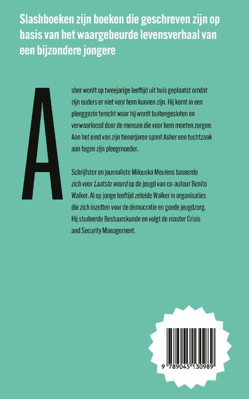 Een dappere strijd tegen onrecht Asher wordt op tweejarige leeftijd uit huis geplaatst omdat zijn ouders er niet voor hem kunnen zijn. Hij komt in een pleeggezin terecht waar hij wordt buitengesloten en verwaarloosd door de mensen die voor hem moeten zorgen. Aan het eind van zijn tienerjaren spant Asher een tuchtzaak aan tegen zijn pleegmoeder en wint. Ze mag nooit meer pleegkinderen in huis nemen of op een andere manier in de jeugdzorg werken. Laatste woord neemt de lezer mee in het leven van een jongen die weigert slachtoffer te zijn. Hij gaat de strijd aan tegen het onrecht dat hem werd aangedaan. Voor zichzelf, om het af te kunnen sluiten, en voor andere kinderen in de jeugdzorg die recht hebben op een veilig onderkomen.