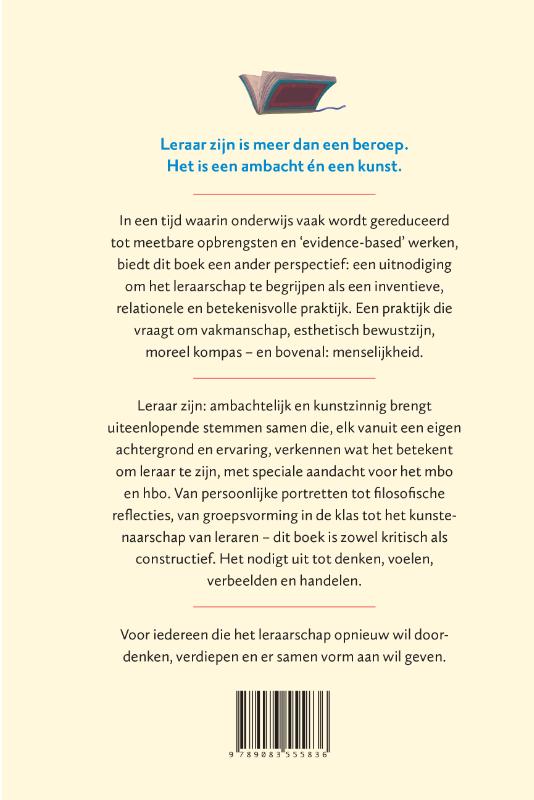 Leraar zijn is meer dan een beroep. Het is een ambacht én een kunst. In een tijd waarin onderwijs vaak wordt gereduceerd tot meetbare opbrengsten en ‘evidence-based’ werken, biedt dit boek een ander perspectief: een uitnodiging om het leraarschap te begrijpen als een inventieve, relationele en betekenisvolle praktijk. Een praktijk die vraagt om vakmanschap, esthetisch bewustzijn, moreel kompas – en bovenal: menselijkheid. Leraar zijn: ambachtelijk en kunstzinnig brengt uiteenlopende stemmen samen die, elk vanuit een eigen achtergrond en ervaring, verkennen wat het betekent om leraar te zijn, met speciale aandacht voor het mbo en hbo. Van persoonlijke portretten tot filosofische reflecties, van groepsvorming in de klas tot het kunstenaarschap van leraren – dit boek is zowel kritisch als constructief. Het nodigt uit tot denken, voelen, verbeelden en handelen. Voor iedereen die het leraarschap opnieuw wil doordenken, verdiepen en er samen vorm aan wil geven.