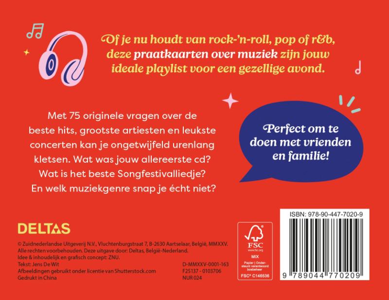Of je nu houdt van rock-'n-roll, pop of r&b, deze praatkaarten over muziek zijn jouw ideale playlist voor een gezellige avond. Met 75 originele vragen over de beste hits, grootste artiesten en leukste concerten kan je ongetwijfeld urenlang kletsen. Wat was jouw allereerste cd? Wat is het beste Songfestivalliedje? En welk muziekgenre snap je écht niet? Perfect om te doen met vrienden en familie!Of je nu houdt van rock-'n-roll, pop of r&b, deze praatkaarten over muziek zijn jouw ideale playlist voor een gezellige avond. Met 75 originele vragen over de beste hits, grootste artiesten en leukste concerten kan je ongetwijfeld urenlang kletsen. Wat was jouw allereerste cd? Wat is het beste Songfestivalliedje? En welk muziekgenre snap je écht niet? Perfect om te doen met vrienden en familie! Gebracht in een stevig doosje met magneetsluiting.