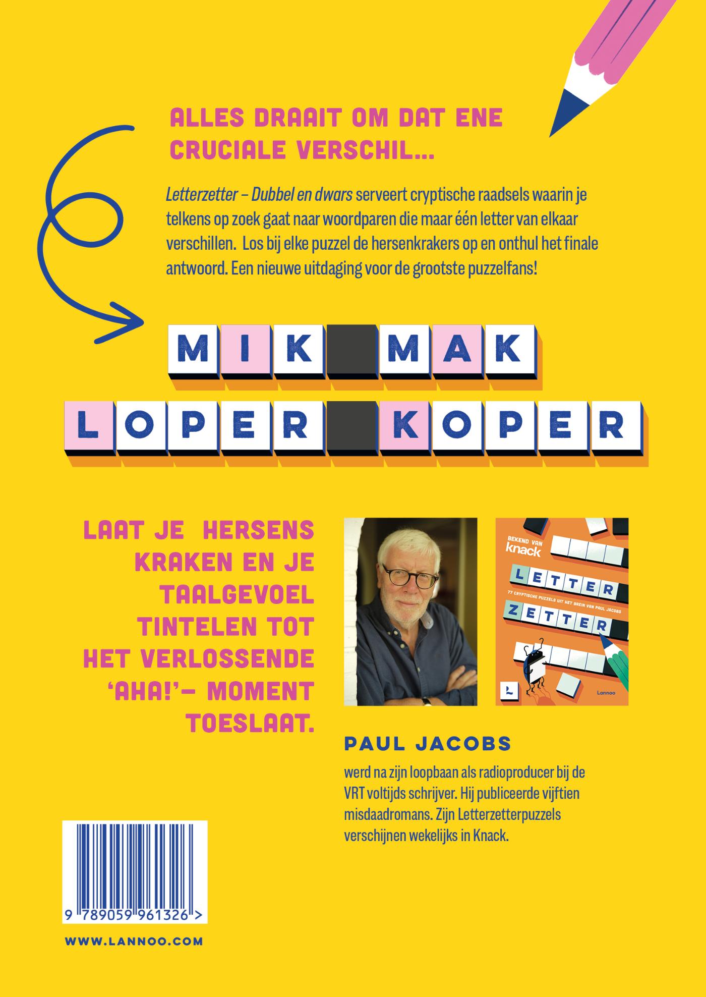 Letterzetter – Dubbel en dwars serveert cryptische raadsels waarin je telkens op zoek gaat naar woordparen die maar één letter van elkaar verschillen. Los bij elke puzzel de hersenkrakers op en onthul het finale antwoord. Een nieuwe uitdaging voor de grootste puzzelfans! Laat je hersens kraken en je taalgevoel tintelen tot het verlossende ‘aha!’- moment toeslaat.