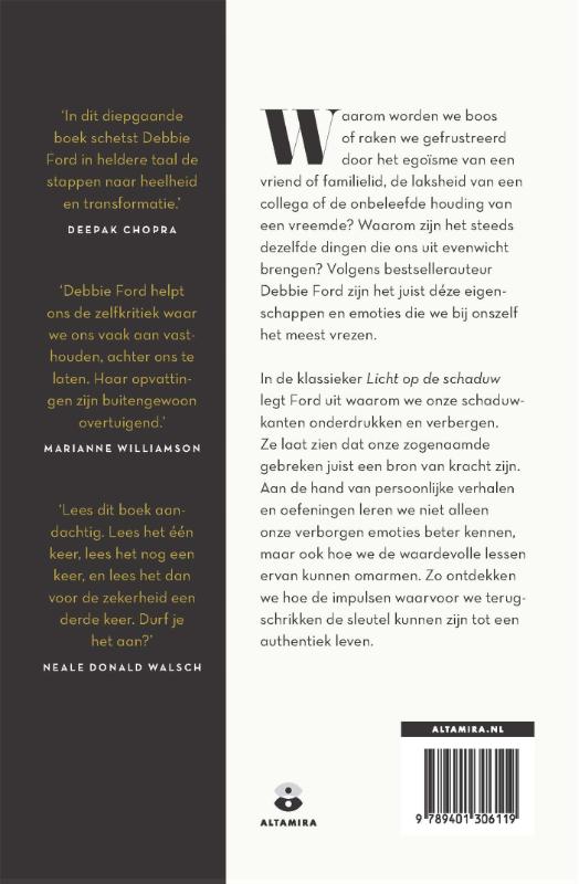 Dé klassieker over schaduwwerk (shadow work). In 'Licht op de schaduw' legt bestsellerauteur Debbie Ford uit waarom we onze schaduwkanten onderdrukken en verbergen. Deze schaduwkanten zouden zogenaamde zwakheden laten zien, maar volgens Ford zijn dit helemaal geen zwakheden. Je schaduwkanten zijn juist kwaliteiten én een bron van kracht waar je uit kunt putten om jezelf beter te leren begrijpen. Aan de hand van oefeningen en persoonlijke verhalen leren we deze schaduwkanten en de emoties die erbij komen kijken kennen, evenals de lessen die zij ons kunnen én willen leren. Met haar unieke visie op en kennis van schaduwwerk geeft Ford je de tools om de gevoelens en kanten van jezelf waar je voor terugdeinst, te omarmen. 'Licht op de schaduw' is hét schaduwwerk-boek voor iedereen die zijn schaduwkant wil leren kennen.
