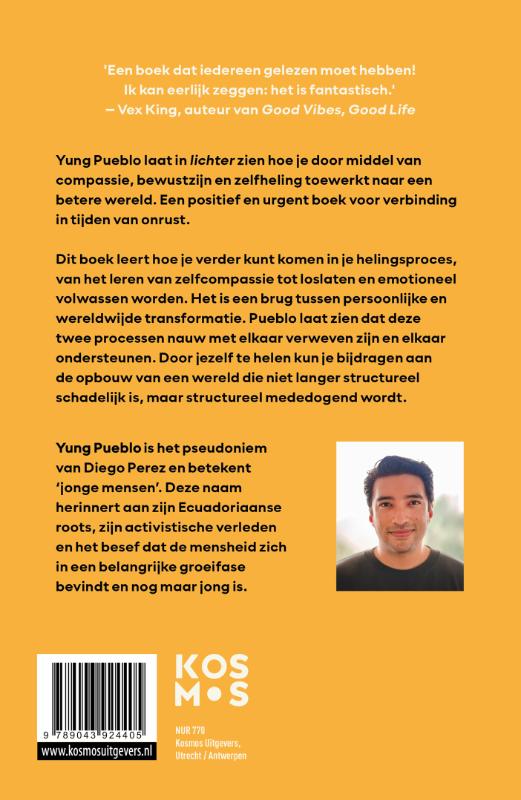 Yung Pueblo laat zien hoe je door middel van zelfcompassie, bewustzijn en zelfheling toewerkt naar een betere wereld. Een positief en onmisbaar boek voor verbinding in tijden van onrust. “In de jaren dat ik mezelf in de steek had gelaten, voelden mijn gedachten onmiskenbaar zwaar. Ik wist dat ik een duidelijke manier moest vinden om me lichter te voelen.” Yung Pueblo’s zelfheling begon nadat jarenlang drugsgebruik zijn tol had geëist. Door angsten waarvoor hij lange tijd was weggelopen te onderzoeken en aan te pakken, voelde hij zich niet langer een vreemdeling in lichaam en geest. Dankzij meditatie en vertrouwen op zijn intuïtie, voelde hij zich mentaal lichter met meer liefde van binnenuit. Het liet hem zien dat zelfheling mogelijk is. In zijn non-fictie debuut lichter laat Yung Pueblo zien hoe je verder kunt komen in je helingsproces; van het ontwikkelen van zelfcompassie tot loslaten en emotioneel volwassen worden. Naarmate de zwaarte wegvalt en je hoofd niet meer overladen is met spanning, kun je verbinden met het heden. En wanneer je jouw zelfbewustzijn vergroot, kun je positief bijdragen aan de gezondheid en harmonie van de hele mensheid. Het laatste deel slaat de brug tussen persoonlijke en wereldwijde transformatie. Yung Pueblo’s hoop is dat we zo allemaal bijdragen aan een positievere toekomst. Yung Pueblo is het pseudoniem van Diego Perez en betekent ‘jonge mensen’. Deze naam herinnert aan zijn Ecuadoriaanse roots, zijn activistische verleden en het besef dat de mensheid zich in een belangrijke groeifase bevindt. #1 NEW YORK TIMES BESTSELLER ‘Een empathisch en wijs boek dat je zal begeleiden op een reis naar een dieper inzicht in jezelf.’ - Nedra Tawwab, auteur van Set Boundaries, Find Peace ‘Ik kan eerlijk zeggen dat het fantastisch is.’ - Vex King, auteur van Good Vibes, Good Life