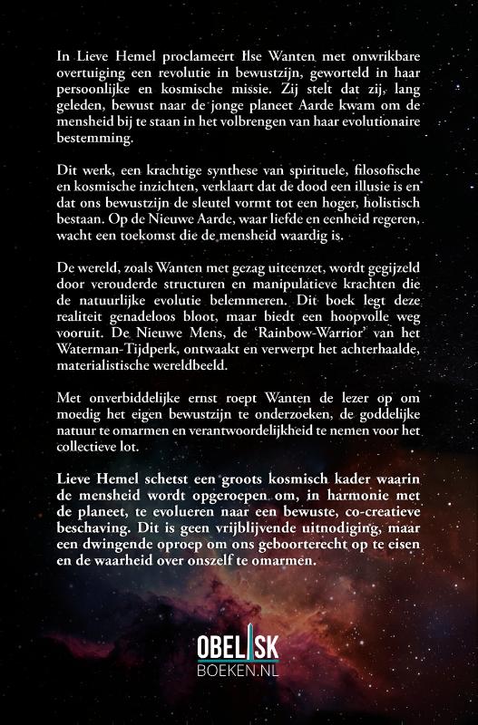 In Lieve Hemel proclameert Ilse Wanten met onwrikbare overtuiging een revolutie in bewustzijn, geworteld in haar persoonlijke en kosmische missie. Zij stelt dat zij, lang geleden, bewust naar de jonge planeet Aarde kwam om de mensheid bij te staan in het volbrengen van haar evolutionaire bestemming. Dit werk, een krachtige synthese van spirituele, filosofische en kosmische inzichten, verklaart dat de dood een illusie is en dat ons bewustzijn de sleutel vormt tot een hoger, holistisch bestaan. Op de Nieuwe Aarde, waar liefde en eenheid regeren, wacht een toekomst die de mensheid waardig is. De wereld, zoals Wanten met gezag uiteenzet, wordt gegijzeld door verouderde structuren en manipulatieve krachten die de natuurlijke evolutie belemmeren. Dit boek legt deze realiteit genadeloos bloot, maar biedt een hoopvolle weg vooruit. De Nieuwe Mens, de ‘Rainbow-Warrior’van het Waterman-Tijdperk, ontwaakt en verwerpt het achterhaalde, materialistische wereldbeeld. Met onverbiddelijke ernst roept Wanten de lezer op om moedig het eigen bewustzijn te onderzoeken, de goddelijke natuur te omarmen en verantwoordelijkheid te nemen voor het collectieve lot. Lieve Hemel schetst een groots kosmisch kader waarin de mensheid wordt opgeroepen om, in harmonie met de planeet, te evolueren naar een bewuste, co-creatieve beschaving. Dit is geen vrijblijvende uitnodiging, maar een dwingende oproep om ons geboorterecht op te eisen en de waarheid over onszelf te omarmen.