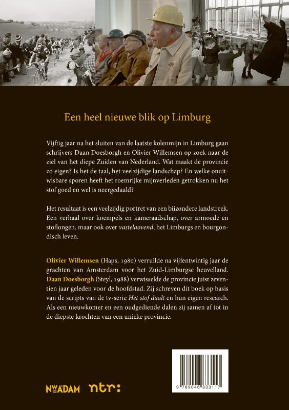 Bekend van TV Met een voorwoord van Winfried Baijens Rijk geïllustreerd, o.a. met beelden uit de tv-serie Vijftig jaar na het sluiten van de laatste kolenmijn in Limburg gaan schrijvers Daan Doesborgh en Olivier Willemsen op zoek naar de ziel van het diepe Zuiden van Nederland. Wat maakt de provincie zo eigen? Is het de taal, het veelzijdige landschap? En welke onuitwisbare sporen heeft het roemrijke mijnverleden getrokken nu het stof goed en wel is neergedaald? Het resultaat is een veelzijdig portret van een bijzondere landstreek. Een verhaal over koempels en kameraadschap, over armoede en stoflongen, maar ook over de vastelaovend , het Limburgs en bourgondisch leven.
