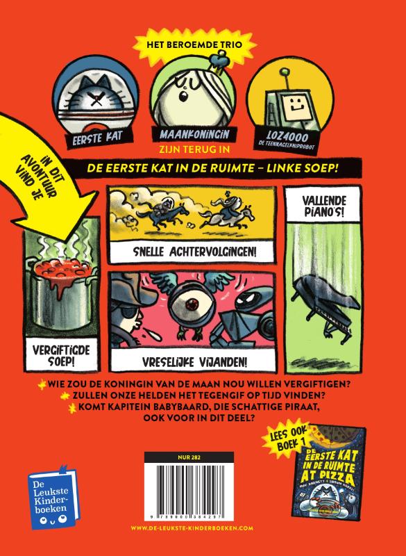 Opnieuw op avontuur met de eerste kat in de ruimte! Nadat de eerste kat in de ruimte de ratten versloeg voordat ze de maan konden opeten, lijkt hij een rustig leventje tegemoet te gaan. Maar dan wordt de maankoningin vergiftigd… met soep! Nu ze maar weinigen in haar hofhouding kan vertrouwen, zal de koningin vergezeld door Eerste Kat het tegengif moeten vinden om dit te overleven. LOZ 4000, die nog steeds op zoek is naar zijn doel in het universum, gaat ook met hen mee. Ons heldhaftige trio weet niet dat ze worden tegengewerkt door onbekende vijanden. In deze wereld vol slechte cowboys, achtervolgingen en vallende piano’s zullen ze moeten samenwerken om de maankoningin te redden voordat het te laat is. Maar of dat gaat lukken? De eerste kat in de ruimte – linke soep is het tweede deel van deze hilarische graphic novel-serie voor de fans van van Dogman en Het leven van een loser. Leuk om zelf te lezen vanaf 7 jaar, ook voor minder fanatieke lezers.