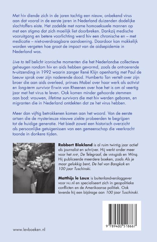 Met hiv diende zich in de jaren tachtig een nieuw, onbekend virus aan dat vooral in de eerste jaren in Nederland duizenden dodelijke slachtoffers eiste. In de eerste jaren was een hiv- of aidsdiagnose een doodvonnis. Het zadelde met name homoseksuele mannen – maar zeker ook vrouwen – op met een stigma dat zich na decennia nog steeds moeilijk laat doorbreken. Dankzij medische vooruitgang en betere voorlichtingscampagnes veranderde dat: hiv werd een chronische en – met medicatie – niet overdraagbare aandoening. Dat maakt het makkelijk om te vergeten hoe groot de impact van de aidsepidemie in Nederland was. Live to tell belicht iconische momenten die het Nederlandse collectieve geheugen hebben gevormd, zoals de ontroerende televisie-uitzending in 1992 waarin zanger René Klijn met Paul de Leeuw openhartig over zijn naderende dood sprak. Humberto Tan vertelt over zijn broer die aan aids overleed, prinses Mabel over haar werk als activist en long-term survivor Erwin van Rheenen over hoe het is om al 40 jaar met het virus te leven. Ook komen minder gehoorde stemmen aan bod: vrouwen, lifetime survivors die met hiv werden geboren, en migranten die in Nederland ontdekten dat ze het virus hebben. Live to tell bevat interviews met meer dan 50 betrokkenen, van de eerste artsen die de mysterieuze nieuwe ziekte probeerden te begrijpen tot de huidige generatie die opgroeit met hiv als chronische aandoening. Het biedt zowel een historisch overzicht als persoonlijke getuigenissen van een gemeenschap die veerkracht toonde in donkere tijden.