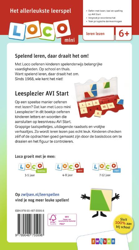 Op een speelse manier oefenen met lezen? Dat kan met Loco mini Leesplezier! In dit boekje oefenen kinderen letters en woorden die aansluiten op leesniveau AVI Start. Met welke puzzel gaat je kind als eerste aan de slag? Met de grappige taalspelletjes, vrolijke verhaaltjes of de uitdagende puzzels? Kinderen bepalen zelf welke opdrachten ze doen en kunnen ook zelf controleren of ze de opdrachten goed hebben gedaan door de doos om te draaien en het bolletjespatroon te controleren. Leren lezen is een feest met Loco mini Leesplezier! Dit oefenboekje is te gebruiken bij de Loco mini basisdoos. Leerdoelen: • Oefen met lezen, taal en spelling op AVI Start • Vergroot je woordenschat • Train je logisch denkvermogen Met het zelfcorrigerende Loco oefent je kind spelenderwijs belangrijke vaardigheden. Op school en thuis. Want spelend leren, daar draait het om. Sinds 1968, wie kent het niet!