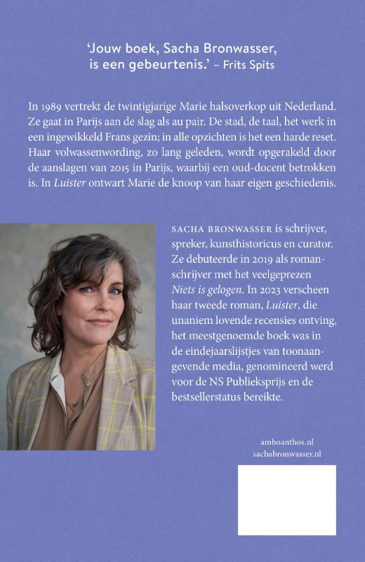 'Onweerstaanbaar beschrijft Sacha Bronwasser het Parijse leven in een roman die tot nadenken stemt. Bronwasser wekt Parijs tot leven in deze sterke roman over een au pair. Soepel en trefzeker voert ze de spanning op.' - 5 sterren, de Volkskrant Het nieuws reisde snel, zoals dat soort nieuws doet. Ik wist dat het ook over jou ging zodra het eerste bericht uit Parijs kwam. Bijna zes jaar geleden nu, op een vrijdag de dertiende. Een datum als een slechte grap. Online meldden allerlei mensen zich 'veilig'. Vrienden, een nichtje, een ver familielid. Oud-studiegenoten, mijn eigen oud-leerlingen. Exposanten van de fotobeurs, je vakgenoten. Anderen, vage kennissen: het verbaasde me hoeveel bekenden aan de rand van het wereldtoneel rondhingen. Jij was daar ook, Flo, en op jouw profiel bleef het stil. Akelig stil, zegt men dan. Shortlist Libris Literatuurprijs 2024, genomineerd voor de NS Publieksprijs 2024. Door Het Parool, de Volkskrant, Trouw en NRC uitgeroepen als een van de beste boeken van 2023. 'Ingenieuze roman (...) Slim verteld en meesterlijk opgebouwd (...) Bronwasser snijdt veel aan in deze roman, maar houdt alles voorbeeldig in de hand. Luister is een roman die bewondering afdwingt.' - Trouw 'Lees het, echt de moeite waard, dat is een aanbeveling van mij. Annemieke Bosman, Opium NPO Radio 4 Sacha Bronwasser vindt taal voor alles wat zich niet of nauwelijks laat herinneren. Het effect is betoverend. Niña Weijers Uit het juryrapport Libris Literatuur Prijs 2024: '[...] IJzersterk geschreven boek, dat je tot de laatste bladzijde in zijn greep houdt. Er staan zinnen in van grote schoonheid, het kent diepgang en zet aan tot wrang-melancholische bespiegelingen [...] magistrale roman [...].