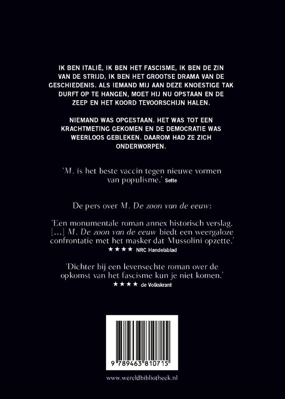 ‘In historische documenten verankerd hyperrealisme met ongepolijste bewoordingen en rauwe beelden. Effectief en meeslepend.’ Trouw Begin 1925. Benito Mussolini staat aan de rand van de dood vanwege een heftige maagzweer die zijn leven van binnenuit bedreigt, maar de ernst van zijn ziekte wordt verborgen gehouden voor het Italiaanse volk. Het regime van Mussolini heeft zojuist een ernstige crisis overleefd na de moord op de socialistische leider Giacomo Matteotti. Niet veel later laat Mussolini zich uitroepen tot Duce: dictator van Italië. Door zijn indrukwekkende vermenging van feit en fictie weet Scurati invoelbaar te maken hoe het is om in het centrum van de macht te zitten. Aanstekelijk en psychologisch treffend beschrijft hij de periode van 1925 tot 1932, de eerste jaren van Mussolini als Duce: de jaren waarin de democratie verdween. M. De man van de voorzienigheid is het tweede deel in Scurati’s serie over Mussolini en het vervolg op het succesvolle M. De zoon van de eeuw.