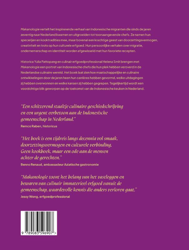 'Makanologie' vertelt het inspirerende verhaal van Indonesische migranten die sinds de jaren zeventig naar Nederland kwamen en uitgroeiden tot toonaangevende chefs. Ze namen hun specerijen en kooktradities mee, maar bovenal een krachtige geest van doorzettingsvermogen, creativiteit en trots op hun culturele erfgoed. Hun persoonlijke verhalen over migratie, ondernemerschap en identiteit worden afgewisseld met hun favoriete recepten. Historica Yulia Pattopang en culinair erfgoedprofessional Helena Smit brengen met 'Makanologie' een portret van Indonesische chefs die hun plek hebben veroverd in de Nederlandse culinaire wereld. Het boek laat zien hoe maatschappelijke en culinaire ontwikkelingen door de jaren heen hun carrières hebben gevormd, welke uitdagingen zij hebben overwonnen en welke kansen zij hebben gegrepen. Tegelijkertijd wordt een voorzichtige blik geworpen op de toekomst van de Indonesische keuken in Nederland.