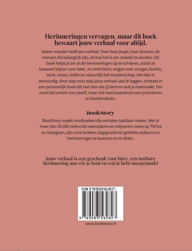 Herinneringen vervagen, maar dit boek bewaart jouw verhaal voor altijd. Iedere moeder heeft een verhaal. Over haar jeugd, haar dromen, de mensen die belangrijk zijn, en hoe het is om moeder te worden. Dit boek helpt je om al die herinneringen op te schrijven, zodat ze bewaard blijven voor later. Je vindt hierin vragen over vroeger, familie, werk, reizen, liefde en natuurlijk het moederschap. Het idee is eenvoudig: door stap voor stap jouw verhaal vast te leggen, ontstaat er een persoonlijk boek dat laat zien wie jij bent en wat je meemaakt. Een mooi document voor jezelf, maar ook heel waardevol voor je kinderen en kleinkinderen. Jouw verhaal is een geschenk voor later, een tastbare herinnering aan wie je bent en wat je hebt meegemaakt.
