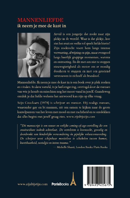 MANNENLIEFDE ik neem je mee de kast in Arvid is een jongetje dat zoekt naar zijn plekje in de wereld. Waar is dat plekje, hoe ziet het eruit en welke rol speelt liefde hierin Zijn zoektocht voert hem langs intense verwarring, afwijzing en pijn, maar evengoed langs heerlijk grappige momenten, warmte en ontroering. En dit met een niet te stoppen nieuwsgierigheid als motor om er moedig doorheen te stappen en met een groeiend vertrouwen in zichzelf als brandstof. Mannenliefde. Ik neem je mee de kast in is een boek over je plek zoeken en vinden. In deze wereld, in je leefomgeving, omringd door de mensen van wie je houdt en misschien nog het meest vanal in jezelf. Gaandeweg ontdek je dat liefde weleens het antwoord kan zijn op elke vraag. Stijn Cnockaert (1978) is schrijver en mentor. Hij nodigt mensen, waaronder gay en bi mannen, uit om samen te kijken naar de grote kantelpunten van het leven met moed en met zachtheid en te ontdekken dat alles begint met jezelf graag zien. “Dit manuscript is een rauwe en eerlijke coming-of-age vertelling die een onuitwisbare indruk achterlaat. De vertelstem is levensecht, gevoelig en doordrenkt van kinderlijke verwondering en pijnlijke volwassenwording. De schrijver weet schijnbaar moeiteloos te schakelen tussen humor, kwetsbaarheid, nostalgie en intens trauma.” — Michelle Shanti, London Books / Paris Books </p