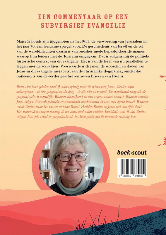 Matteüs houdt zijn tijdgenoten na het 9/11, de verwoesting van Jeruzalem in het jaar 70, een leerzame spiegel voor. De geschiedenis van Israël en de rol van de wereldmachten daarin is van oudsher mede bepaald door de manier waarop hun leiders met de Tora zijn omgegaan. Dat is volgens mij de politiek-historische context van dit evangelie. Het is aan de lezer van nu parallellen te leggen met de actualiteit. Voorwaarde is dat men de woorden en daden van Jezus in dit evangelie niet toetst aan de christelijke dogmatiek, omdat die ontleend is aan de eerder geschreven zeven brieven van Paulus.