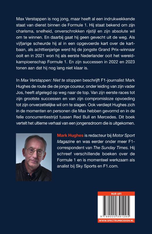 De nieuwe, alomvattende biografie van sportlegende Max Verstappen In deze nieuwe biografie van de kersverse wereldkampioen Max Verstappen vertelt F1-journalist Mark Hughes het complete verhaal van Max' reis naar de top. Max is nog jong, maar heeft al een indrukwekkende staat van dienst binnen de Formule 1. Hij staat bekend om zijn charisma, snelheid, onverschrokken rijstijl en zijn absolute wil om te winnen. En daarbij gaat hij geen gevecht uit de weg. Als vijfjarige scheurde hij al in een opgevoerde kart over de kartbaan, als achttienjarige werd hij de jongste Grand Prix-winnaar ooit en in 2021 won hij als eerste Nederlander ooit het wereldkampioenschap Formule 1. En zijn successen in 2022 en 2023 tonen aan dat hij nog lang niet klaar is. In Max Verstappen: Niet te stoppen beschrijft F1-journalist Mark Hughes de route die de jonge coureur, onder leiding van zijn vader Jos, heeft afgelegd op weg naar de top. Van zijn eerste races tot zijn grootste successen en van zijn compromisloze opvoeding tot zijn onverzettelijke wil om te slagen. Ook verdiept Hughes zich in de momenten en personen die Max hebben gevormd en in de felle concurrentiestrijd tussen Red Bull en Mercedes. Dit boek vertelt het ultieme verhaal van een jongensdroom die is uitgekomen. Mark Hughes is redacteur bij Motor Sport Magazine en was eerder onder meer F1- correspondent van The Sunday Times . Hij schreef verschillende boeken over de Formule 1 en is momenteel werkzaam als analist bij Sky Sports en F1.com.